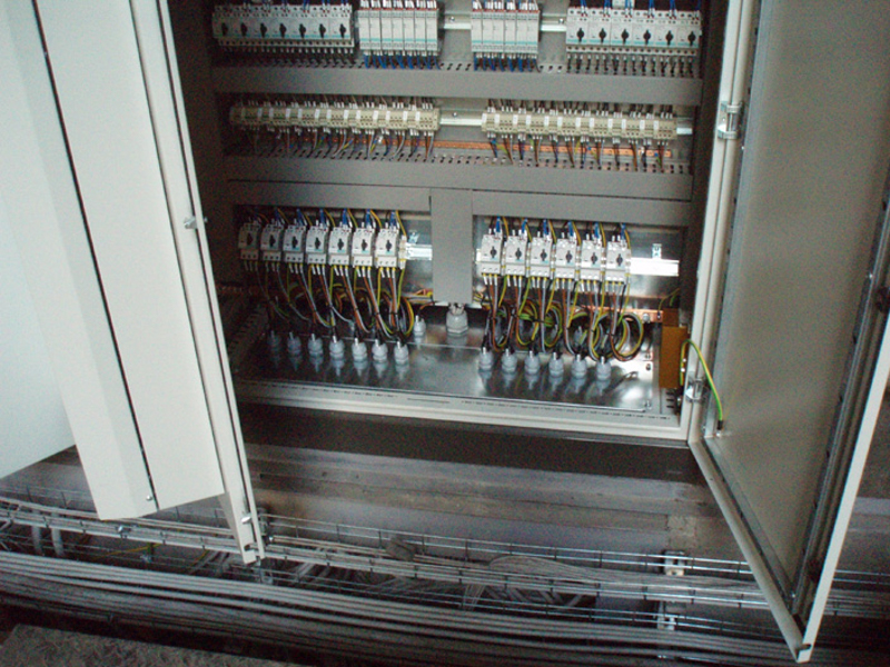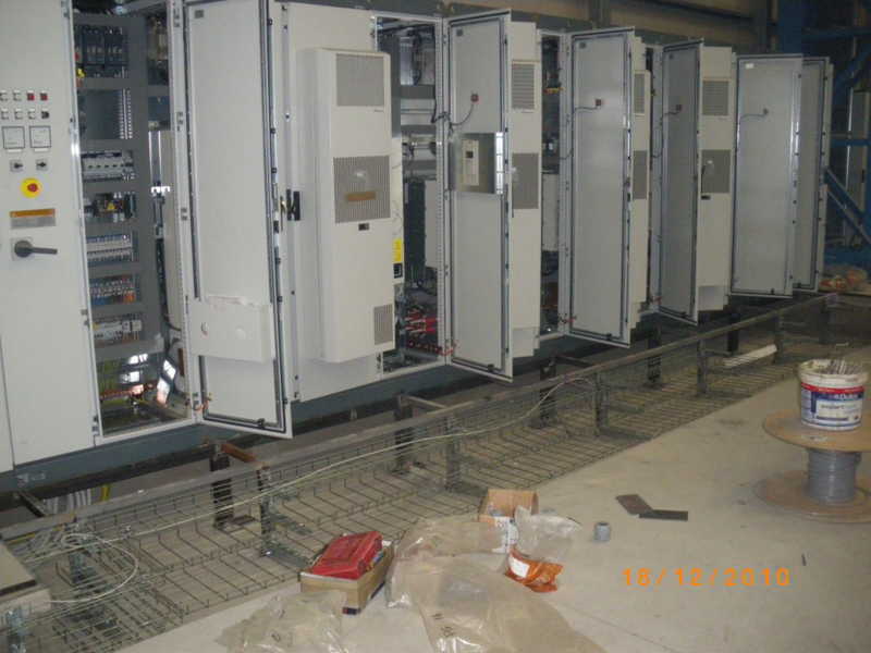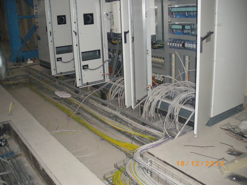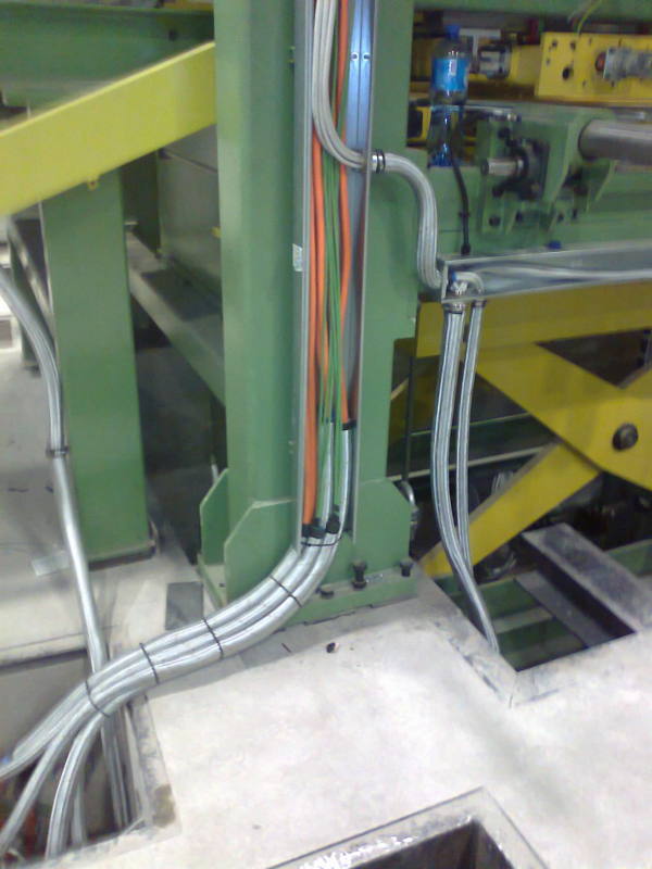 ELIMEC esegue la completa Installazione della Parte Elettrica di ogni Impianto e linea di processo; i cablaggi vengono eseguiti all’interno di passerelle montate all’interno dei cunicoli predisposti intorno all’impianto nelle fondazioni edili e vengono sempre divisi in Tre Livelli: Segnale, Ausiliari e Potenza. I cavi vengono opportunamente collegati ai Quadri Elettrici per andare verso i Banchi Di Comando e a Bordo Macchina dove il collegamento alle Casse Di Derivazione e ai Motori Elettrici viene eseguito attraverso guaine in plastica o in traccia metallica a seconda delle richieste.